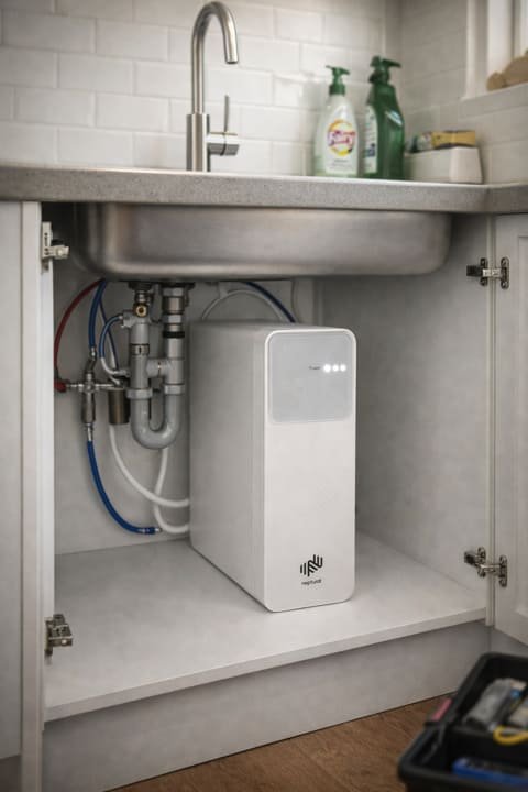 Sistema compacto de ósmosis doméstica para cocinas con poco espacio. Ofrece agua potable de alta calidad sin instalación compleja.